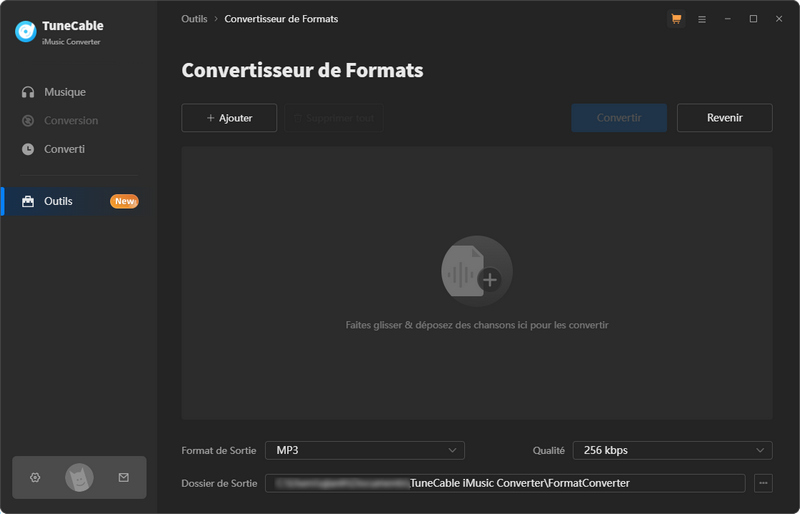 Étape 1. Accédez à "Outils > Convertisseur de Formats" dans l'interface de démarrage. Vous pouvez ensuite importer des fichiers audio locaux dans le convertisseur en cliquant sur "+ Ajouter". Vous pouvez également glisser-déposer les chansons souhaitées directement dans TuneCable. Les formats sources pris en charge incluent MP3, M4A, M4B, WAV, FLAC, OGG, AIFF et M4R.