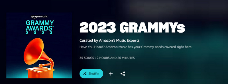 The 2023 Grammy Awards music is not hard to locate on Amazon Music. The music playlist "2023 GRAMMYs" (https://music.amazon.com/playlists/B08P3XMQKT) is curated by Amazon's Music experts, with 35 songs included. About Damn Time, Just Like That, The Heart Part 5, and other 2023 Grammy songs are available here. It also supports further searching for more 2023 Grammy songs and albums.