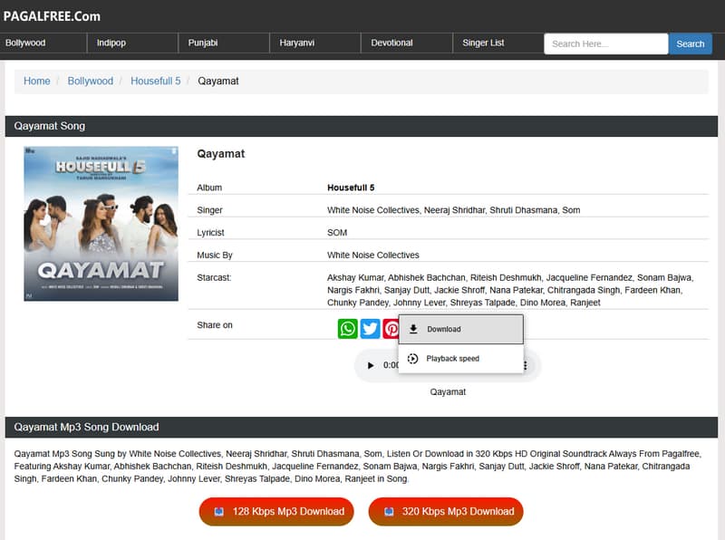 PagalFree is a site that supports downloading music in MP3 format without paying a penny. It supports downloading audio with a maximum quality of 320 kbps. This website focuses on Hindi music and has a great collection of popular Hindi tracks.